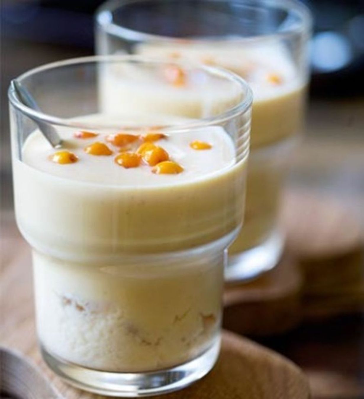 - Sekoita vaniljajogurtti, tyrnimehu ja juokseva hunaja tasaiseksi juomaksi tehosekoittimessa.