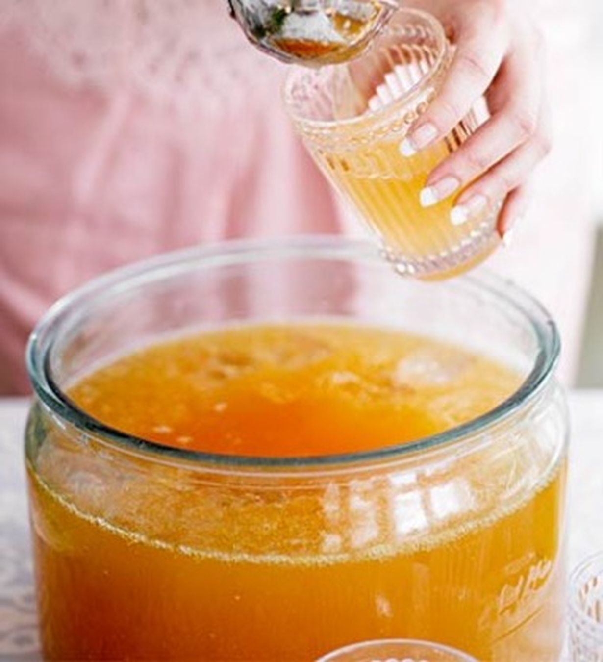 - Kaada kaikki juomat isoon astiaan. Lisää juomaan jääpaloja ja hedelmäviipaleita.