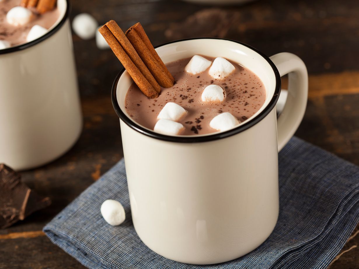 - Kuumenna maito kattilassa, sekoita kaakaojauhe. Laita lusikallinen vaahtokarkkia mukeihin, kaada kaakao päälle ja nauti. Jos vaahtokarkit ovat suuria, voit pilkkoa ne pienemmiksi. Koristele juoma kanelitangolla.