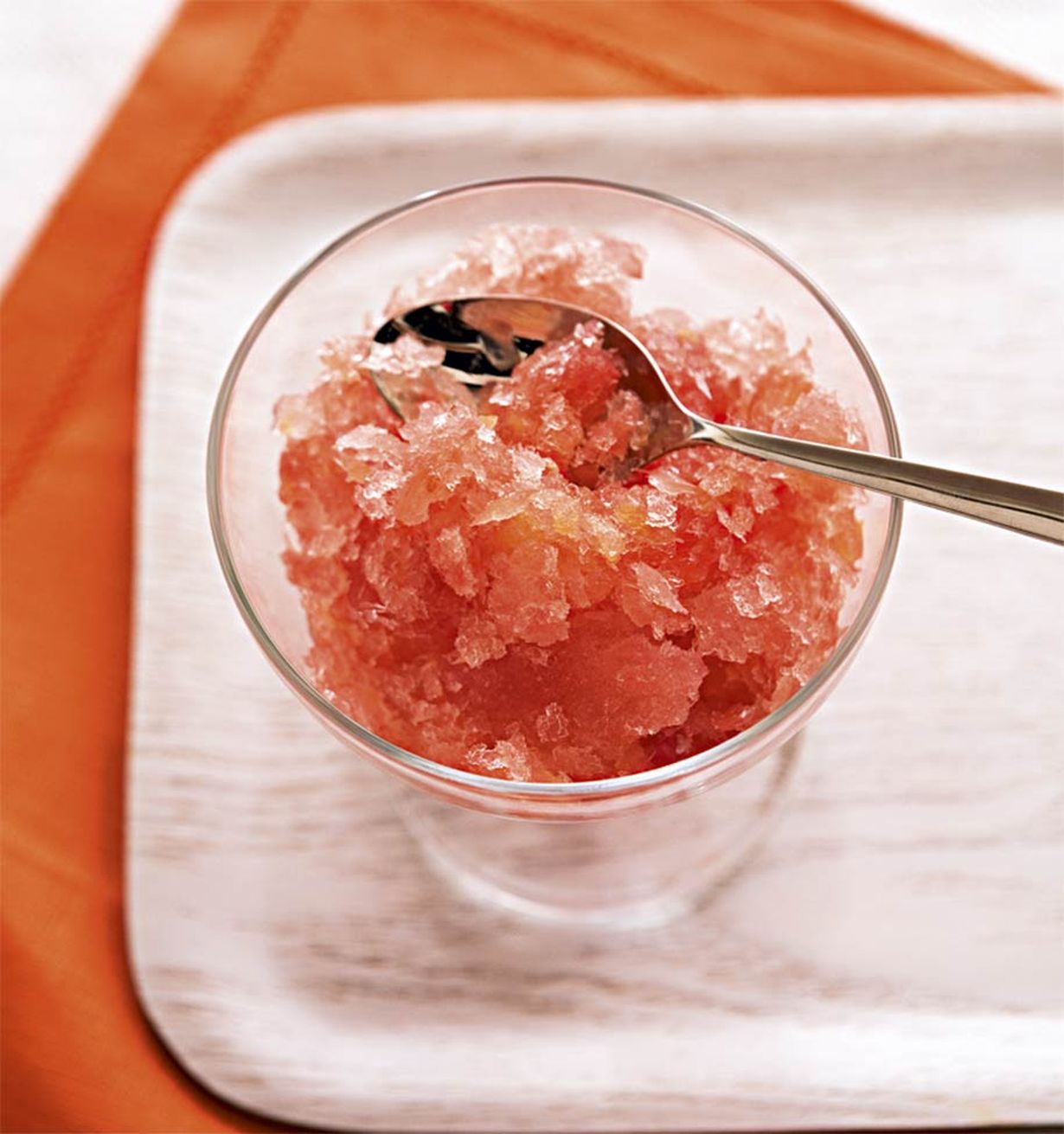Kun mehu on ollut pakastimessa noin 45 minuuttia ja alkaa jäätyä reunoista, riko rakennetta haarukalla. Jatka pakastamista toiset 45 minuuttia ja rouhi seos. Jatka jäädytystä vielä noin 2 tuntia. Rouhi jäätynyt granitaseos haarukalla sohjoksi ja lusikoi annoslaseihin. Tarjoa heti.