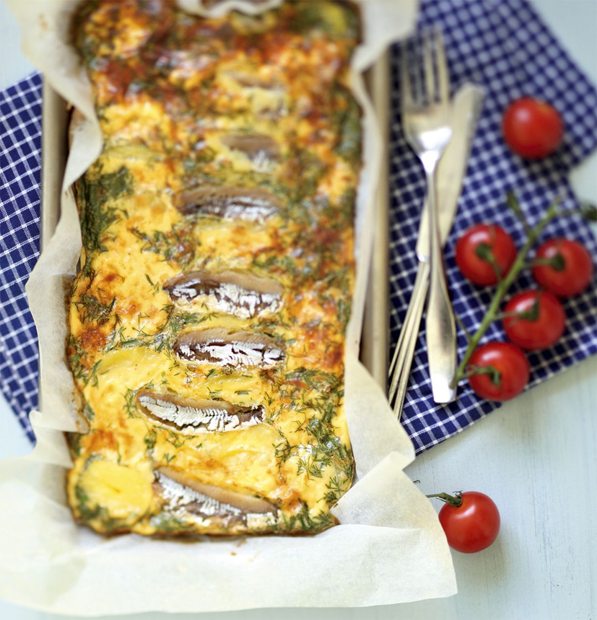 Asettele anjovisfileet tasaisesti vuokaan. Kypsennä 200 asteessa uunin keskitasolla 25-30 minuuttia, kunnes munakasmassa on hyytynyt. Tarjoile raikkaan kirsikkatomaattisalaatin kanssa.