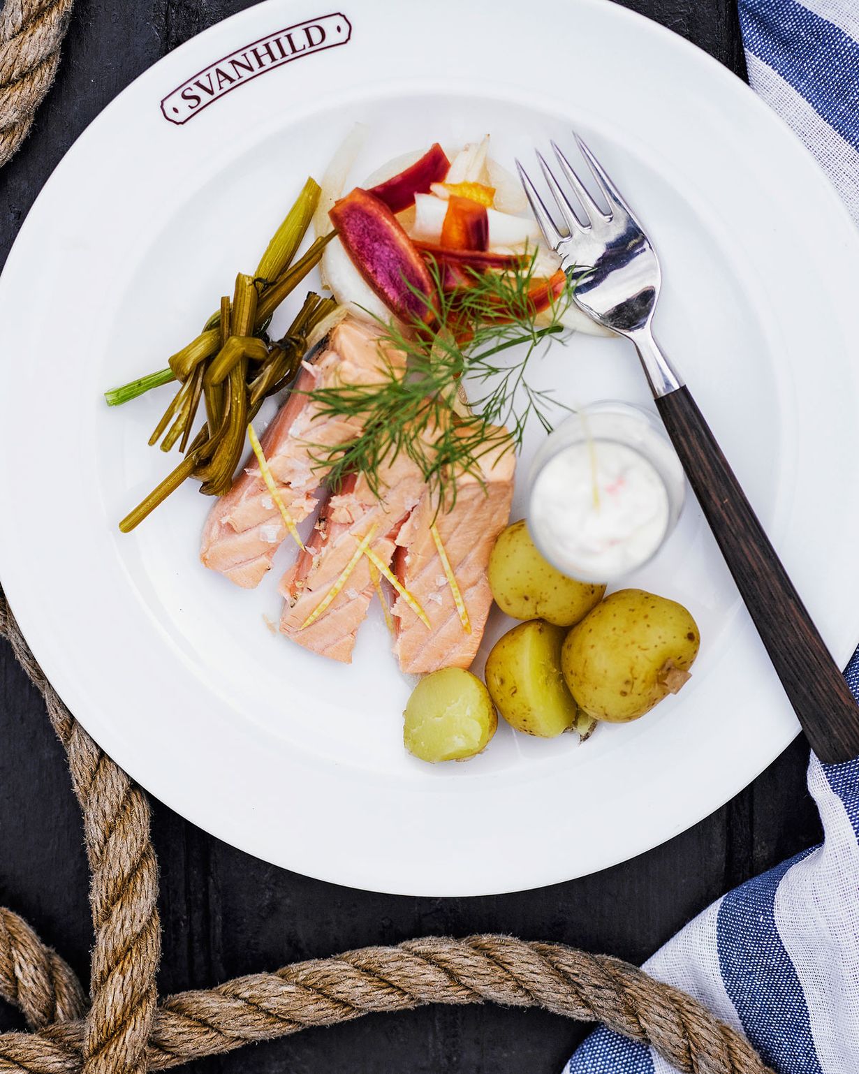 Sitruuna-fenkoliliemessä marinoitu lohi saa pintaansa nopean paiston ja kyytipojakseen keitetyjä pottuja ja jugurttikastiketta.