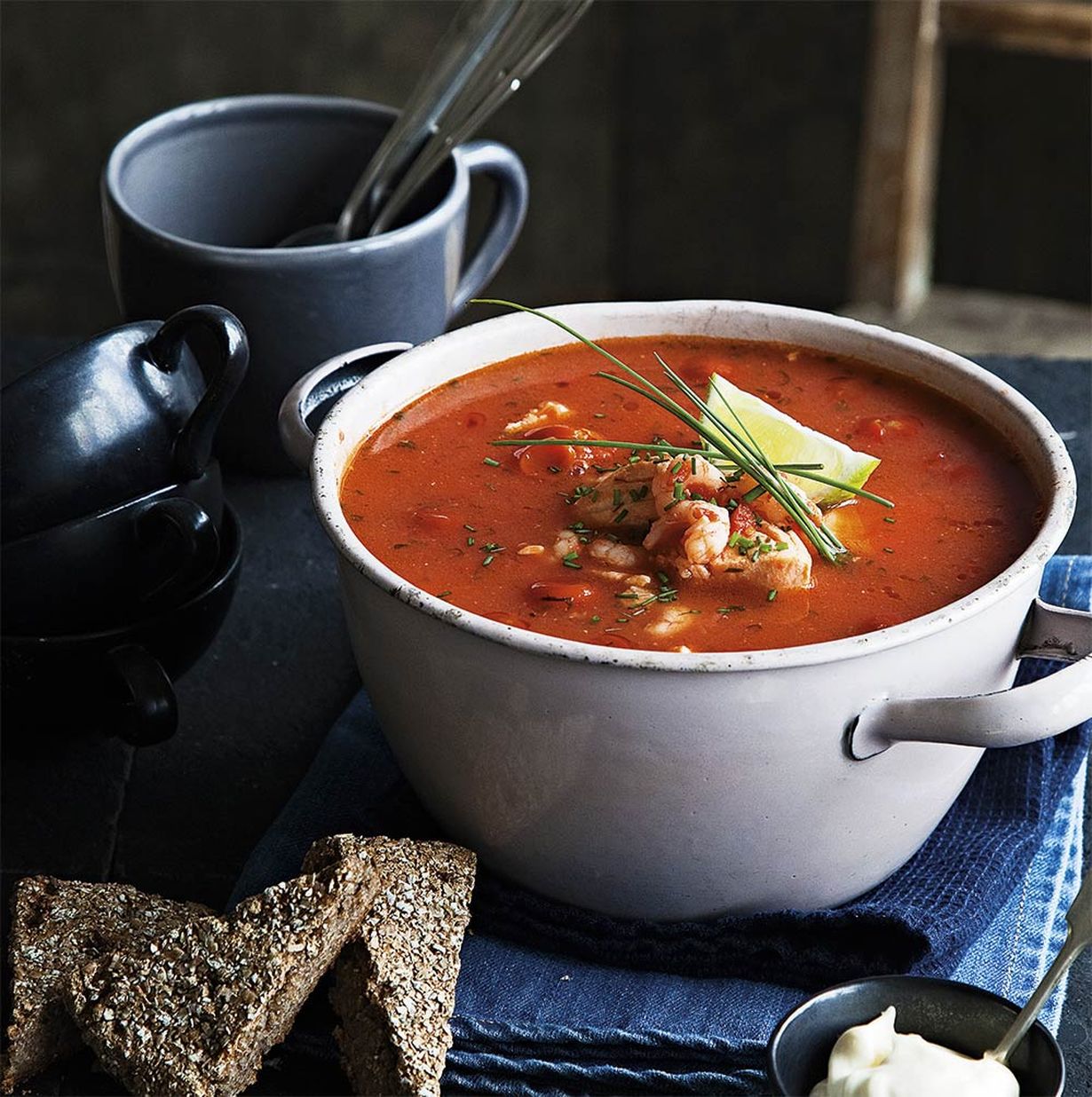 - Lisää lohipalat ja katkaravut kattilaan. Keitä 5–10 minuuttia. Tarkista maku ja lisää tarvittaessa mausteita. Tarjoile saman tien.