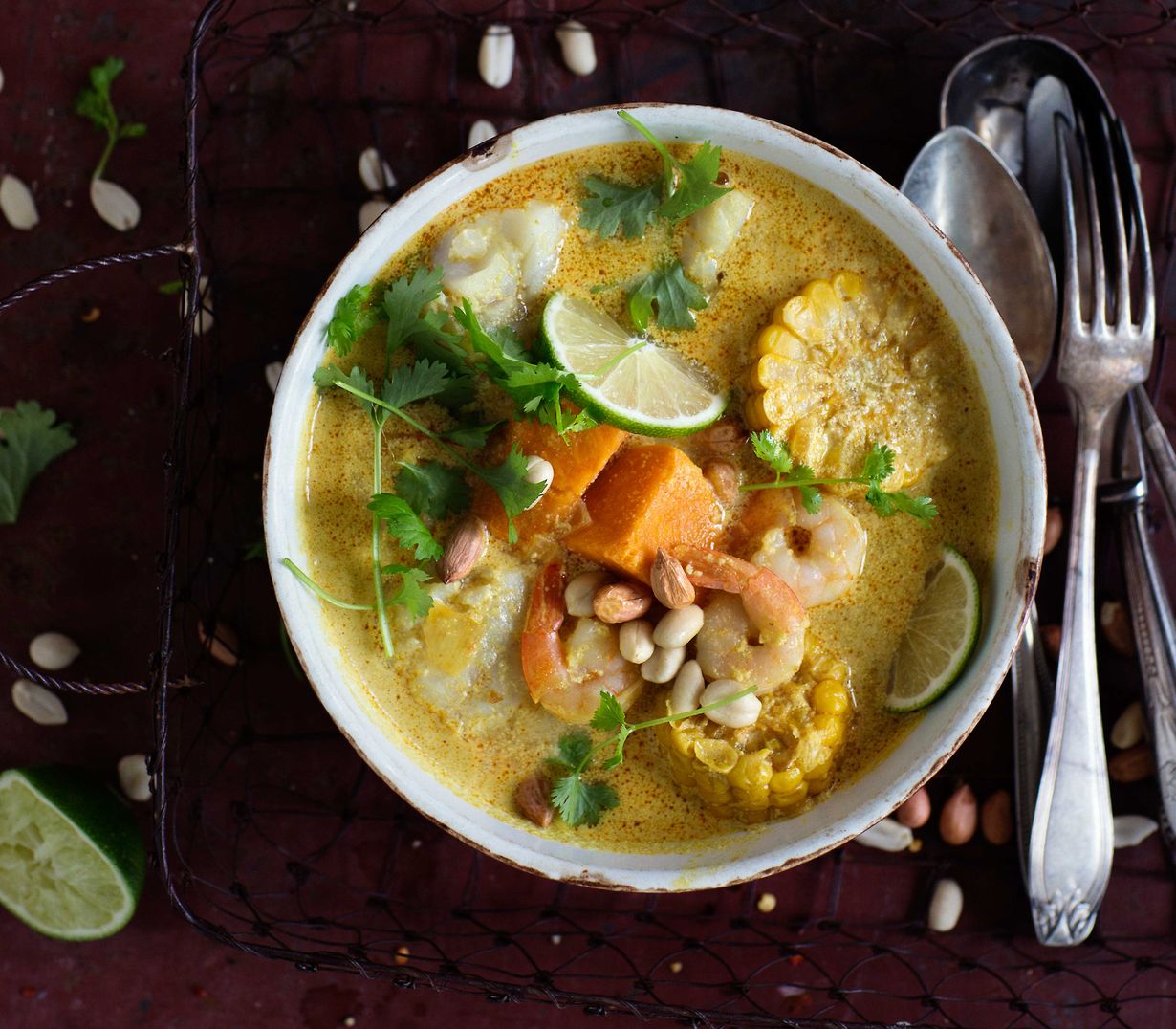 - Hienonna päälle runsaasti korianteria. Tarjoa limettilohkojen ja keitetyn riisin kanssa.