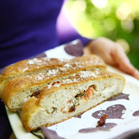 - Ripottele pinnalle reilusti juustoraastetta ja koristele piirakka halkaistuilla kirsikkatomaateilla.