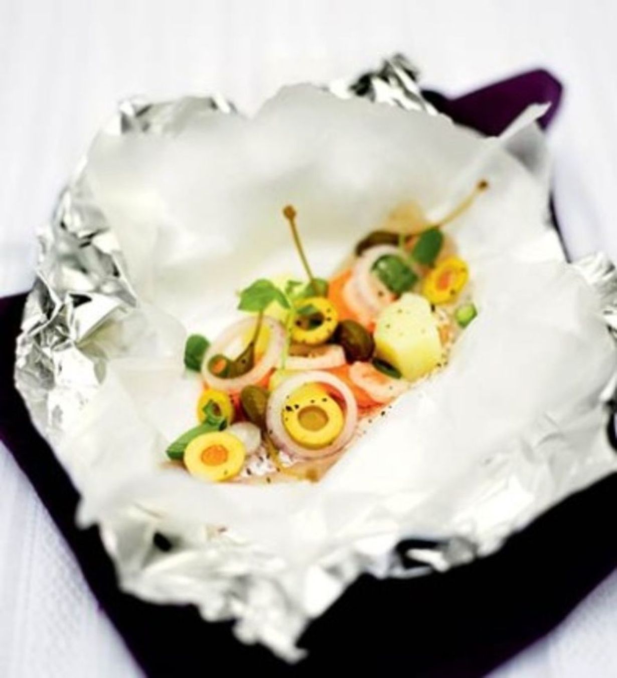 - Repäise foliosta 8 noin 20 x 20 sentin kokoista palaa. Laita kaksi palaa päällekkäin. Nosta paloille kalat ja kasvikset. Lisää kaprikset, oliivit ja yrtit. Ripottele pinnalle suolaa ja pippuria. Lorauta jokaiseen nyyttiin hieman valkoviiniä ja viimeistele voinokareella. Sulje nyytit nipistämällä folion kulmat kiinni.