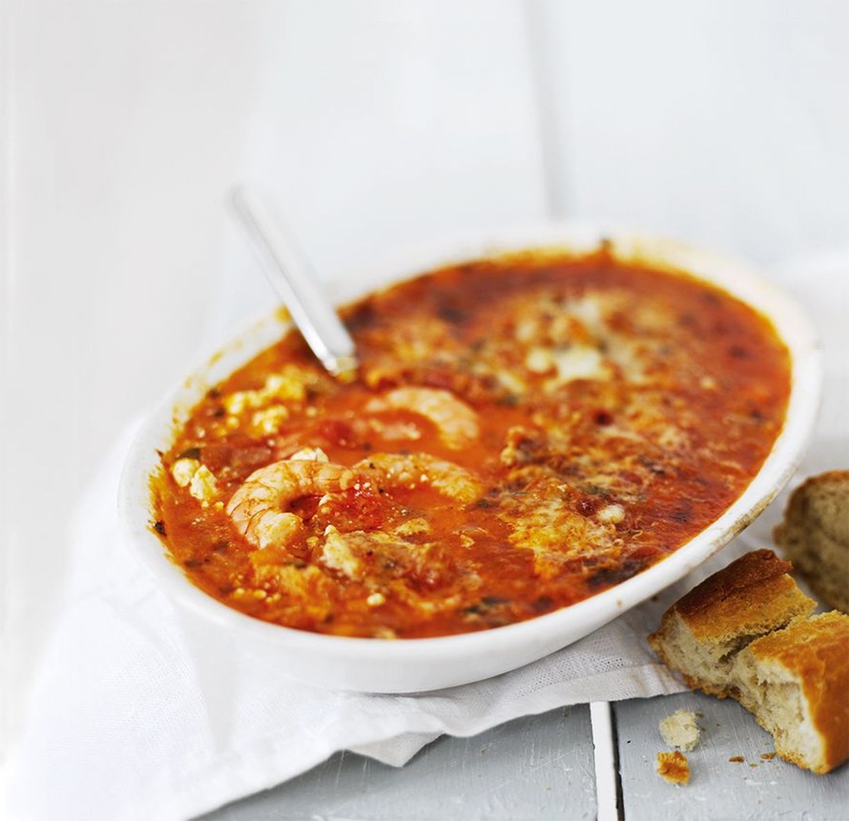 - Nosta maustuneet katkaravunpyrstöt ja hienonnettu valkosipulinkynsi öljyllä voideltuun uunivuokaan. Murenna pinnalle fetaa. Kaada päälle tomaattikastike ja ripottele sen päälle juustoraastetta.