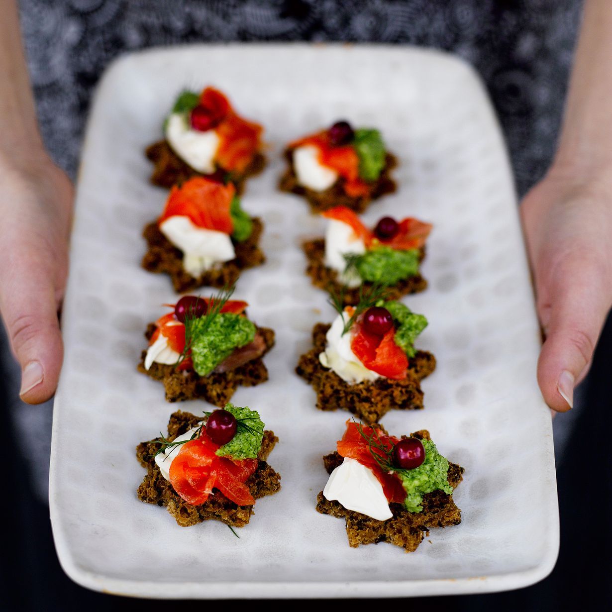 - Laita leipäselle teelusikallinen tillipestoa ja smetanaa. Leikkaa lohesta pieniä viipaleita ja kietaise ne leivän päälle. Koristele tillitupsulla.