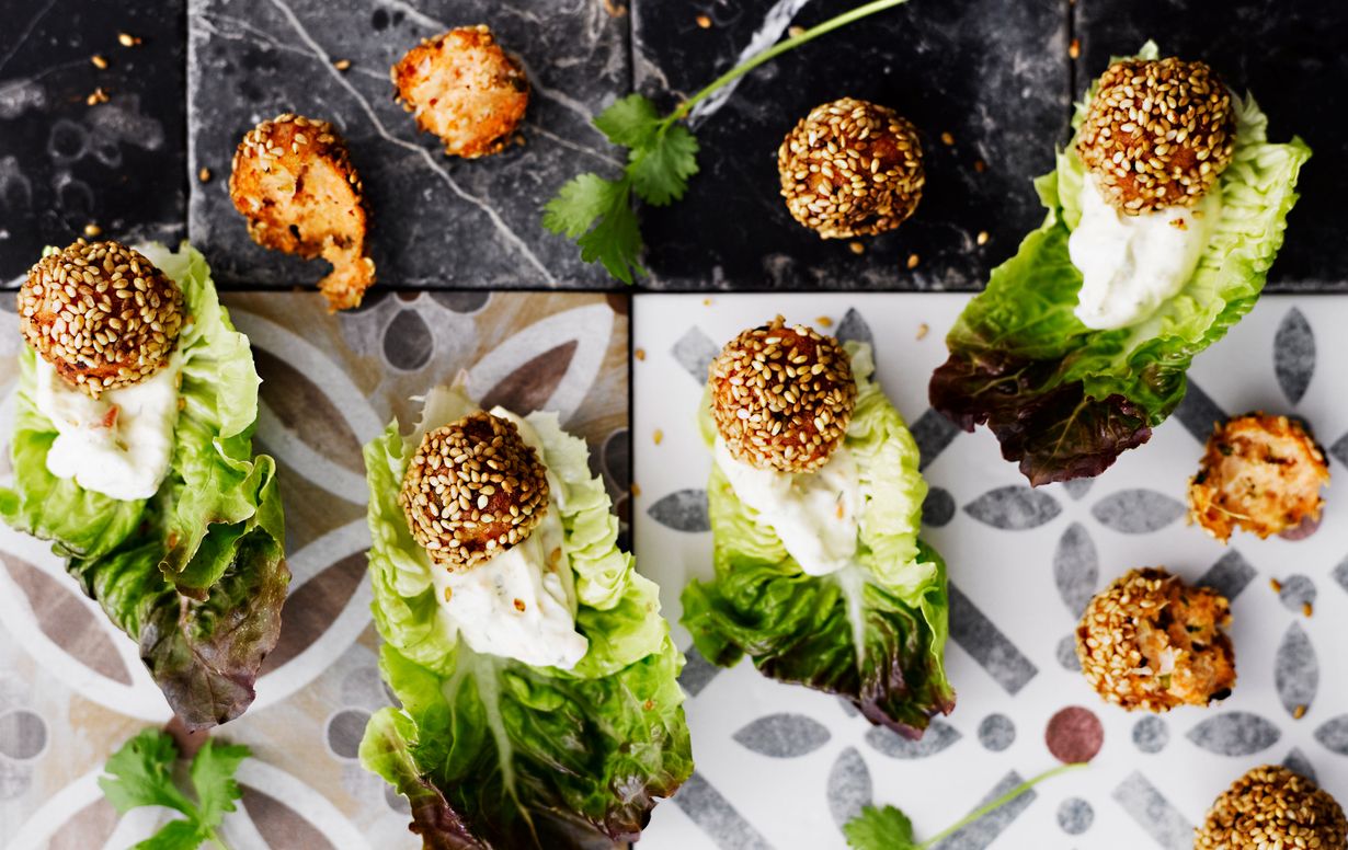 Aasialaisittain maustetut lohipullat ovat herkullista sormiruokaa, kun ne tarjoilee sydänsalaatinlehden päällä.