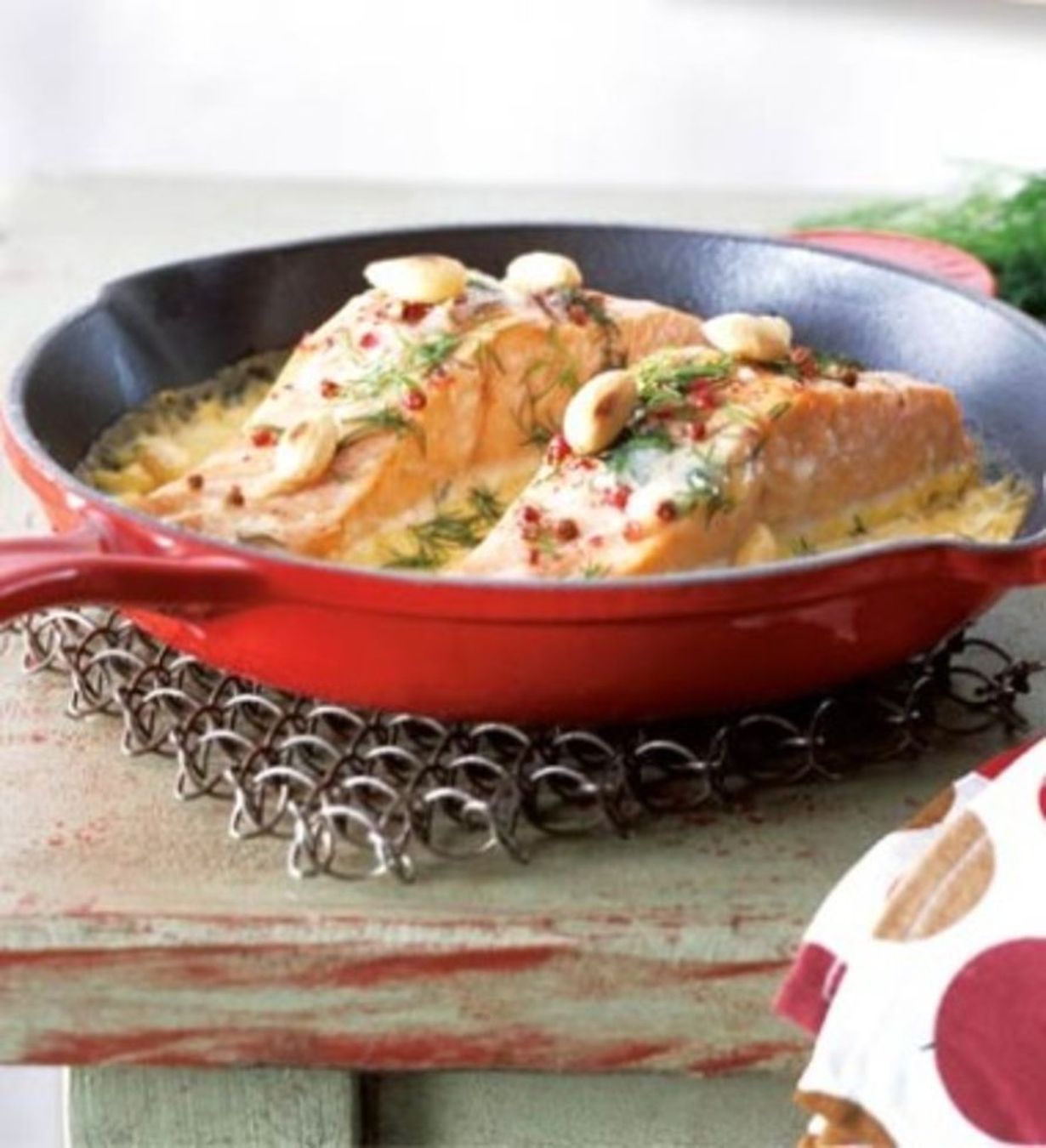 - Asettele lohipalat voideltuun uunivuokaan nahkapuoli alas päin. Purista limetin mehua kalapalojen päälle. Suolaa kalat ja ripottele roseepippuria ja tilliä pinnalle. Anna kalan maustua.