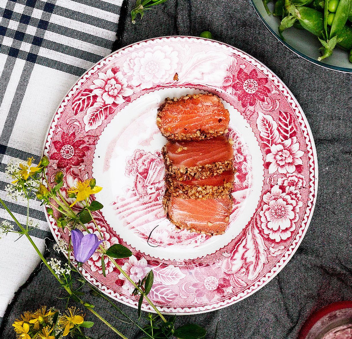 - Sekoita pähkinärouhe ja kaneli lautasella. Kuivaa lohen pinta talouspaperilla ja pyörittele palat pähkinässä.