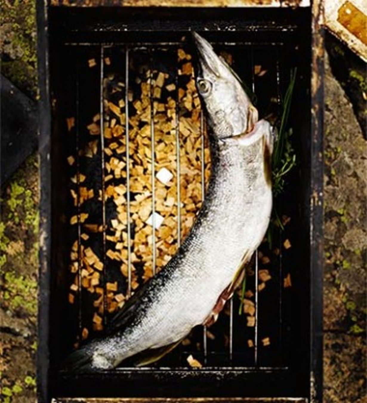 Nosta kala savustuslaatikon ritilälle ja savusta noin 30 minuuttia. Tarkista kalan kypsyys. Jos selkäevä irtoaa helposti, kala on kypsä.