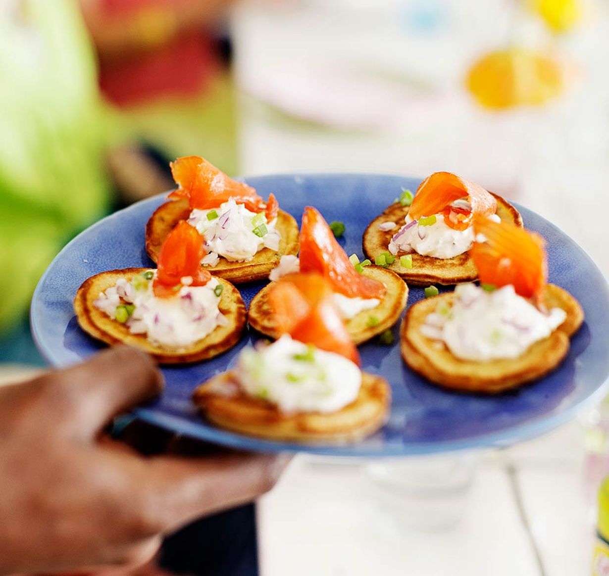 Nosta lettusille nokare piparjuurimoussea. Koristele lohiviipaleilla.