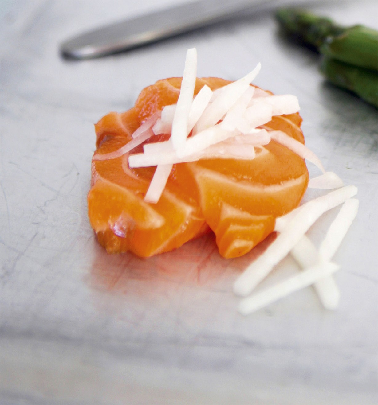 Tarjoile lisäksi ohuiksi suikaleiksi leikattua retikkaa tai porkkanaa.