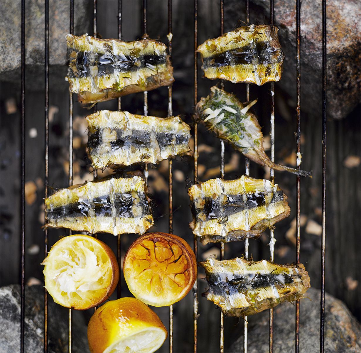 - Halkaise hyvin pestyt sitruunat ja aseta päälle mozzarellaviipaleet. Nosta ritilälle. Savusta täytettyjä muikkupihvejä ja sitruunan-puolikkaita 10–15 minuuttia.