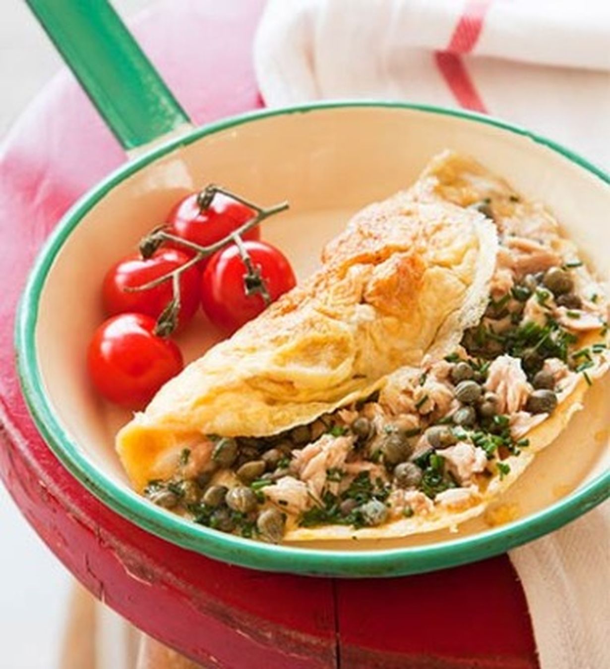 Kuumenna öljy pannussa. Kaada munamassa pannulle ja anna kypsyä hetki. Lisää munakkaan päälle täyteaineet ja jatka kypsentämistä, kunnes munakas on hyytynyt. Mausta tonnikalaa halutessasi suolalla ja pippurilla. Tarjoa sellaisenaan tai salaatin kera.