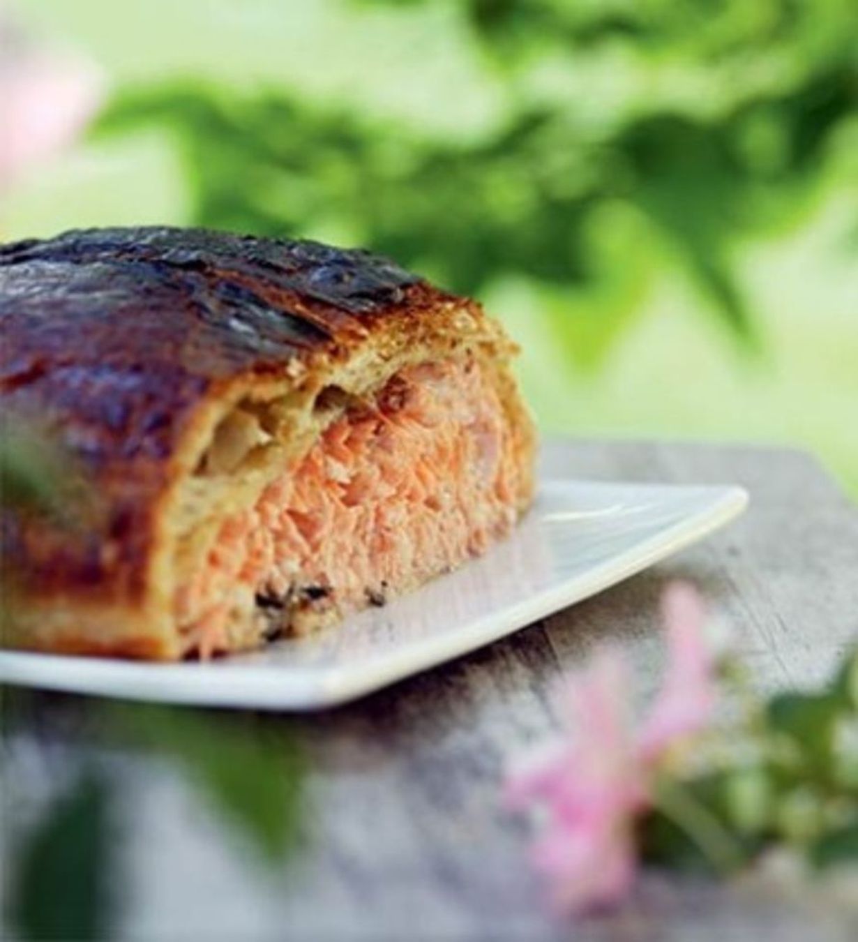 Lohi hautuu lempeästi taikinakuoren sisällä mausteiden ja yrttien kanssa.