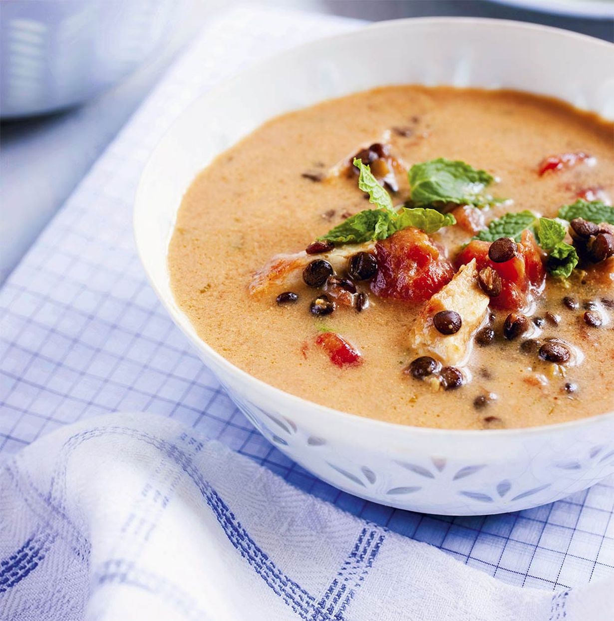 - Pane pehmeiden linssien sekaan kuullotettu sipuli-mausteseos, tomaattimurska ja soija. Keitä hetken aikaa ja soseuta keittopohja. Lisää sekaan paistetut broilerisuikaleet, kookosmaito, sitruunamehu, sivuun otetut linssit ja silputtua minttua. Lisää tarvittaessa kasvislientä. Anna hautua hetki ja nosta tarjolle.