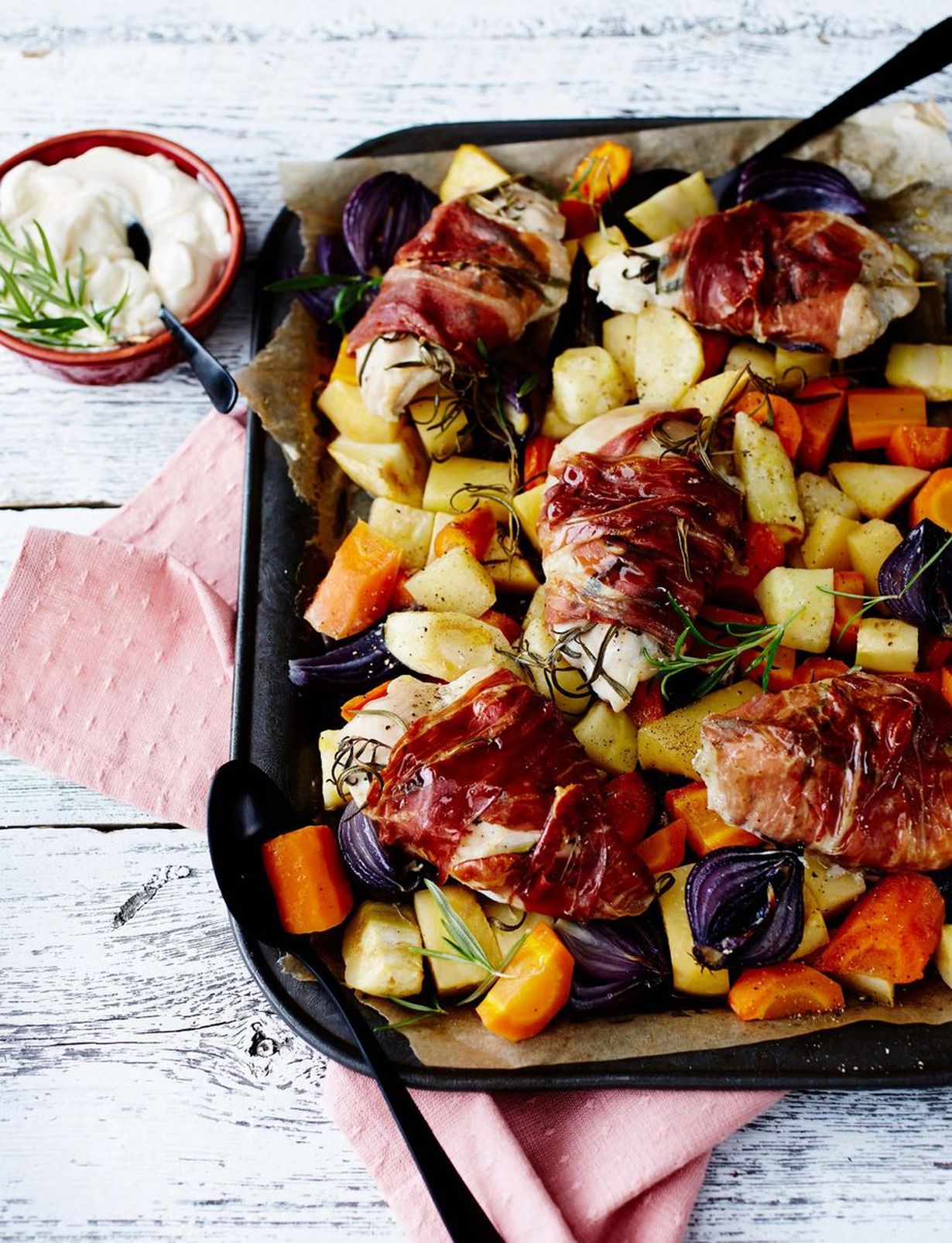 - Kuivaa broilerifileiden pinnat talouspaperilla. Ripottele fileille suolaa ja pippuria. Aseta kunkin fileen päälle rosmariinin oksa ja kääri jokainen filee kahteen kinkkuviipaleeseen. Nosta broilerikääreet juuresten päälle.