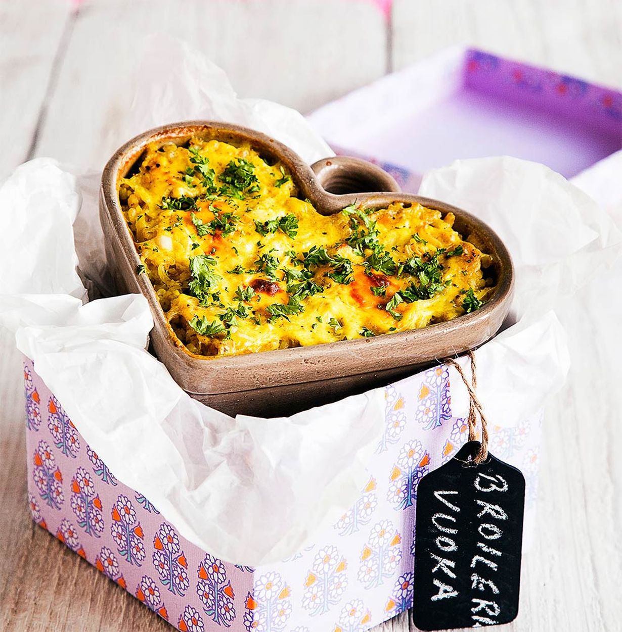 Broilerilaatikko valmistetaan vaihteeksi riisi-ohra-seoksesta. Makua laatikko saa ananaksesta, fetasta ja maissista.