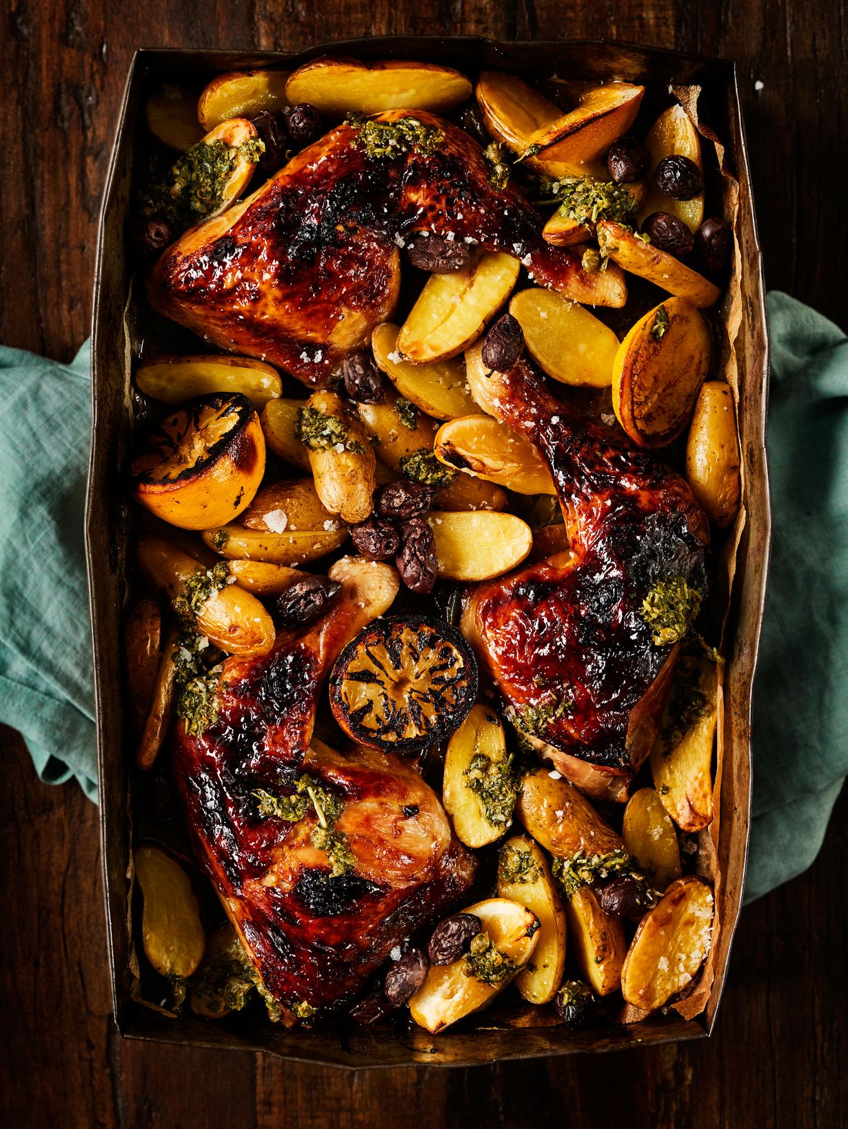 6. Ota pelti uunista. Laske lämpö 200 asteeseen. Sivele koivet ja sitruunat pellille valuneella liemellä. Levitä perunat ja oliivit pellille koipien lomaan ja pirskota öljy päälle.
