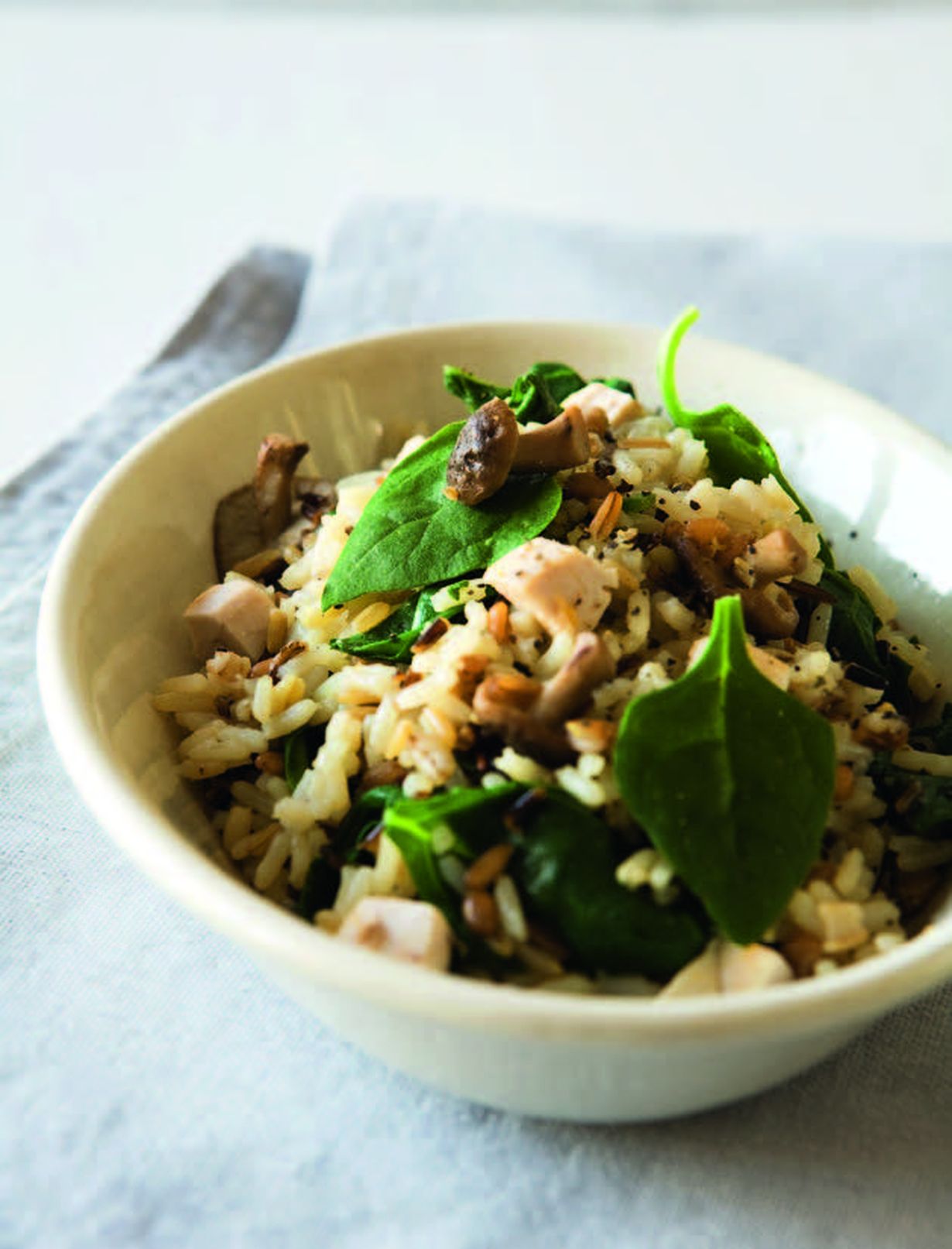 - Laita pannulle pesty pinaatti ja kuutioitu broilerinliha. Sekoita hyvin. Anna muhia muutama minuutti. Viimeistele riisi halutessasi paahdetuilla auringonkukansiemenillä.