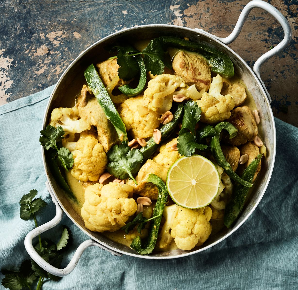 - Pyöräytä joukkoon kukkakaalit ja paprikat. Kaada pannulle kookoskerma.
