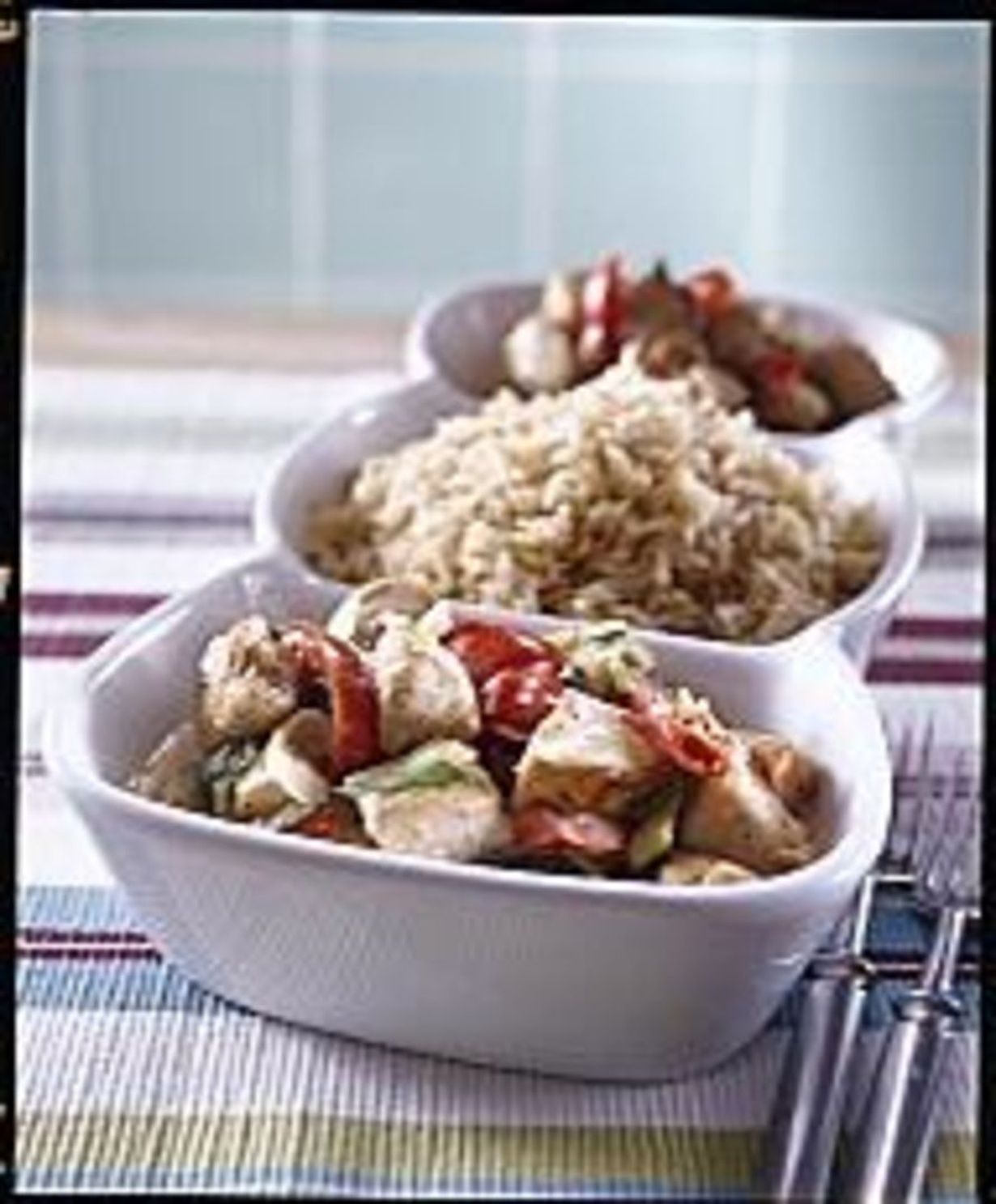 - Kuumenna öljy ja chilijauhe paistinpannulla. Laita broilerikuutiot joukkoon ruskistumaan 10 minuutiksi. Lisää pannulle purjo ja paprika. Jatka paistamista 5 minuuttia.