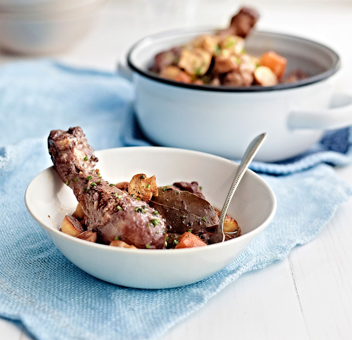 - Kuori ja viipaloi sipulit ja porkkanat. Kuullota niihin kaunis väri pintaan pannulla voissa. Lisää pataan broilereiden joukkoon. Kaada päälle viini ja lisää mausteet. Anna hautua miedohkolla lämmöllä, kannella peitettynä, 40 minuuttia tai kunnes isoimmatkin broileripalat ovat melkein kypsiä.