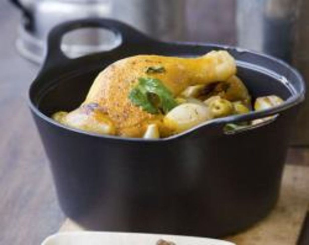 - Sulje kansi ja pane uunin alatasolle 160 asteeseen puoleksi tunniksi. Poista kansi ja jatka kypsentämistä noin tunti tai kunnes liha on kypsää eli irtoaa helposti luista ja neste on saonnut paksuksi kastikkeeksi. Käännä lihapaloja ajoittain kypsennyksen aikana. Lisää loppuvaiheessa säilötty sitruunatahna, oliivit ja voinokare. Hauduta vielä 15 minuuttia. Tarjoa kuumana riisin tai kuskusin kanssa.