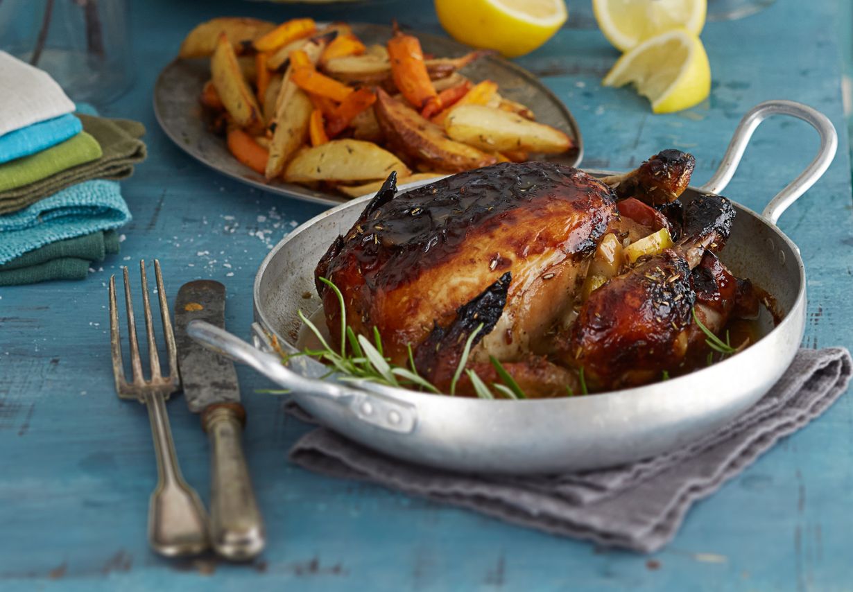 Omena-rosmariinibroileri ja sitruunamarinoidut juurekset