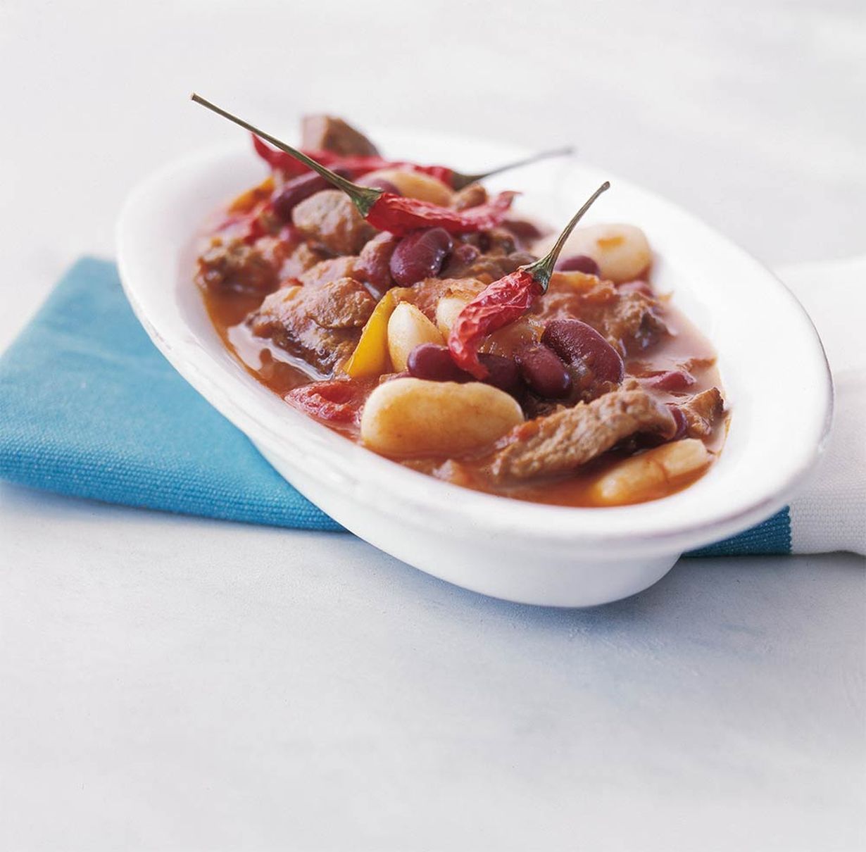 Väriä lihapataan saat erivärisillä paprikoilla ja pavuilla.