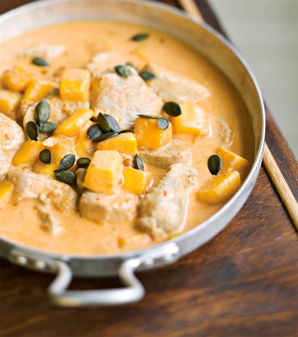 Lisää lopuksi sulaneet mangokuutiot. Koristele halutessasi kurpitsansiemenillä. Tarjoa riisin kanssa.