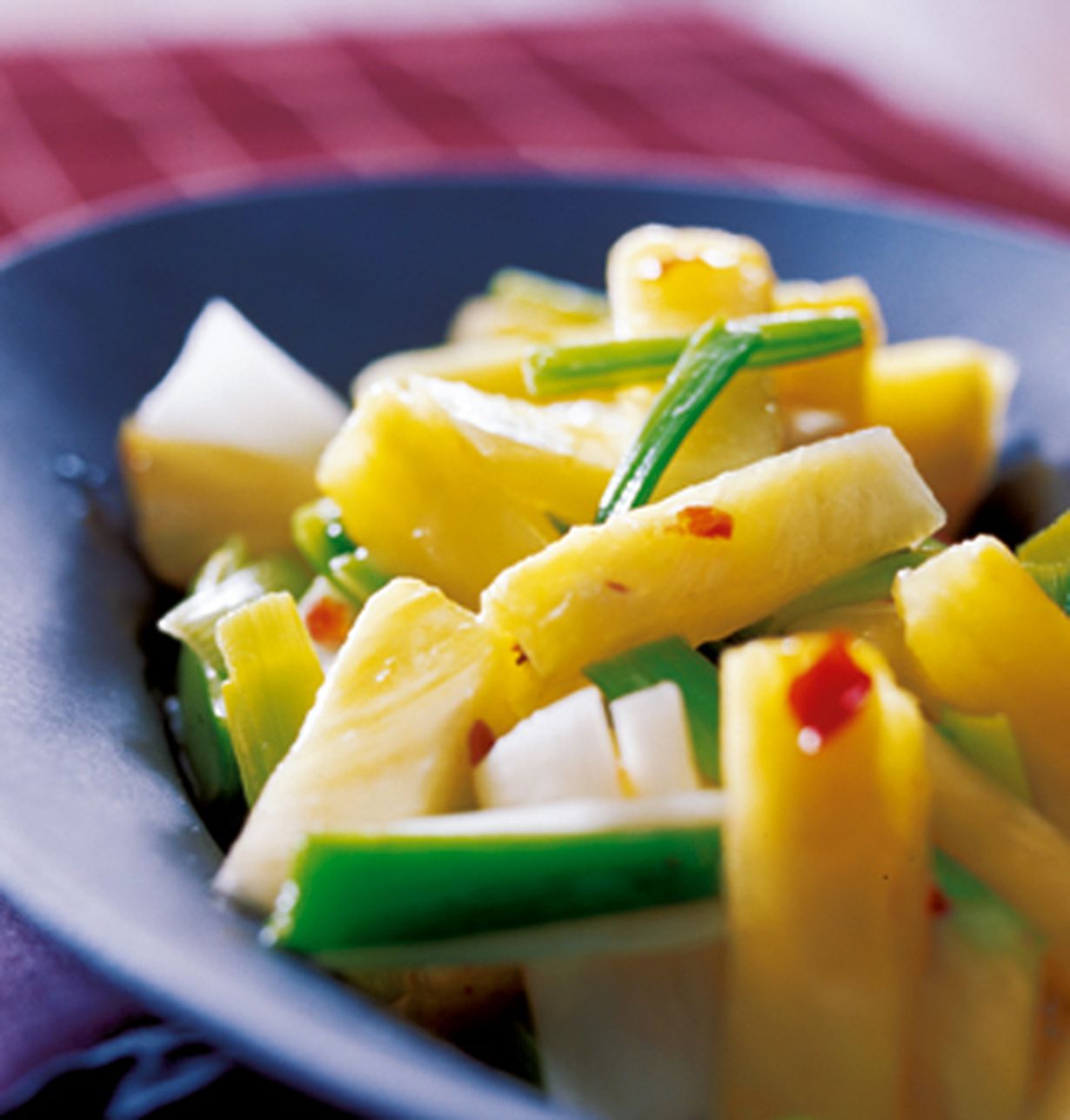 Kuori ja paloittele ananas pieniksi kuutioiksi. Suikaloi mintun lehdet. Silppua chili, josta siemenet on poistettu, pieneksi hakkelukseksi. Sekoita kaikki yhteen. Anna makujen vetäytyä jääkaapissa pari tuntia tai yön yli.