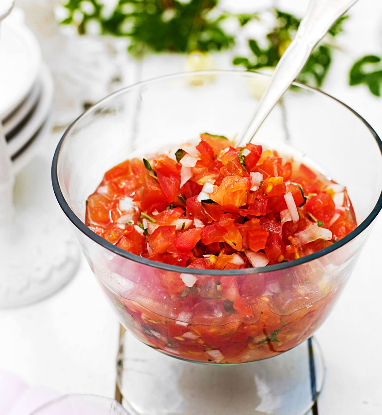 Puolita tomaatit ja poista siemenet. Pilko tomaatin hedelmäliha pienehköiksi kuutioiksi ja nosta sivuun. Kuori ja silppua punasipulit pieneksi ja pane palat kulhoon.