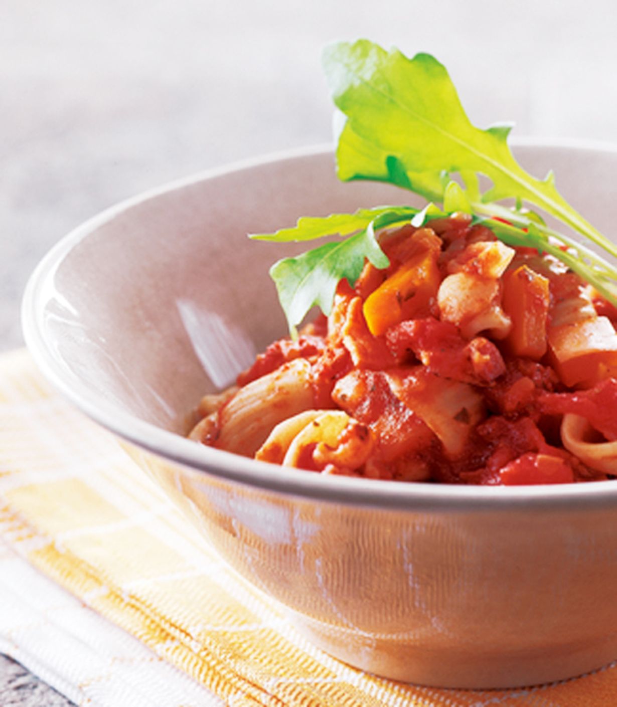 Lisää tomaattimurska, tonnikala öljyineen, soija, tabasco ja fariinisokeri. Sekoita ja hauduta 10 minuuttia.
