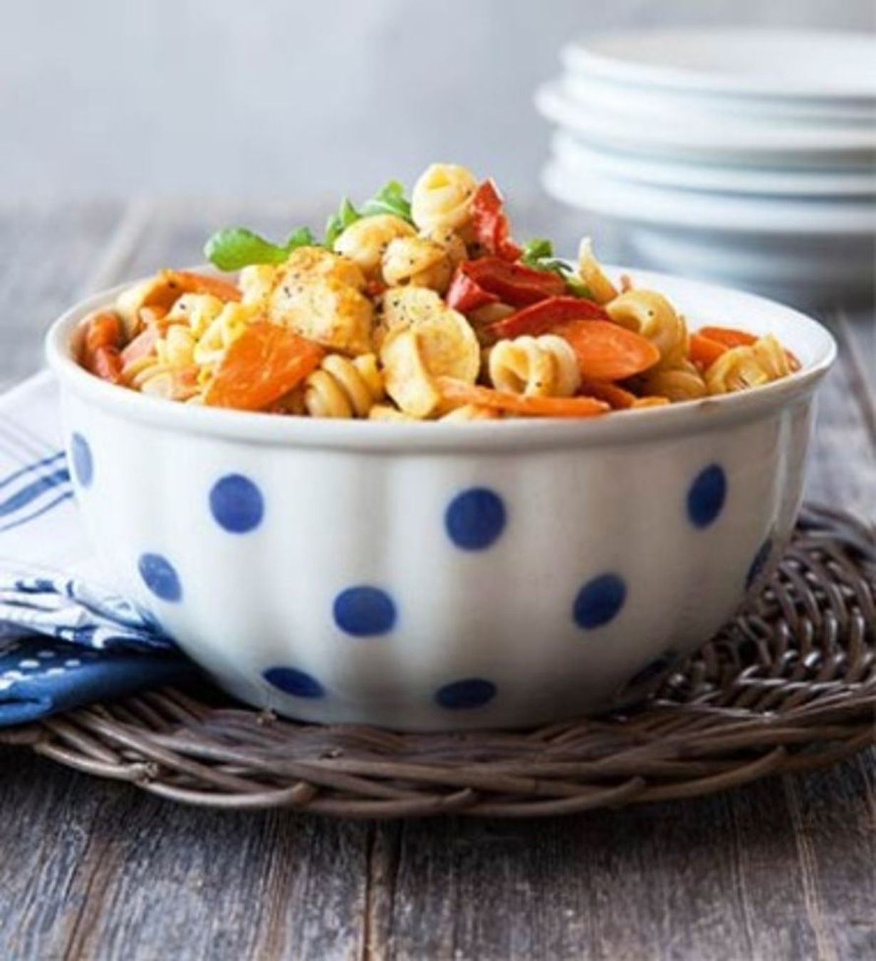 - Lisää kasvisten sekaan broileri, tuorejuusto ja kerma. Kypsennä kannen alla 15 minuuttia välillä sekoitellen.