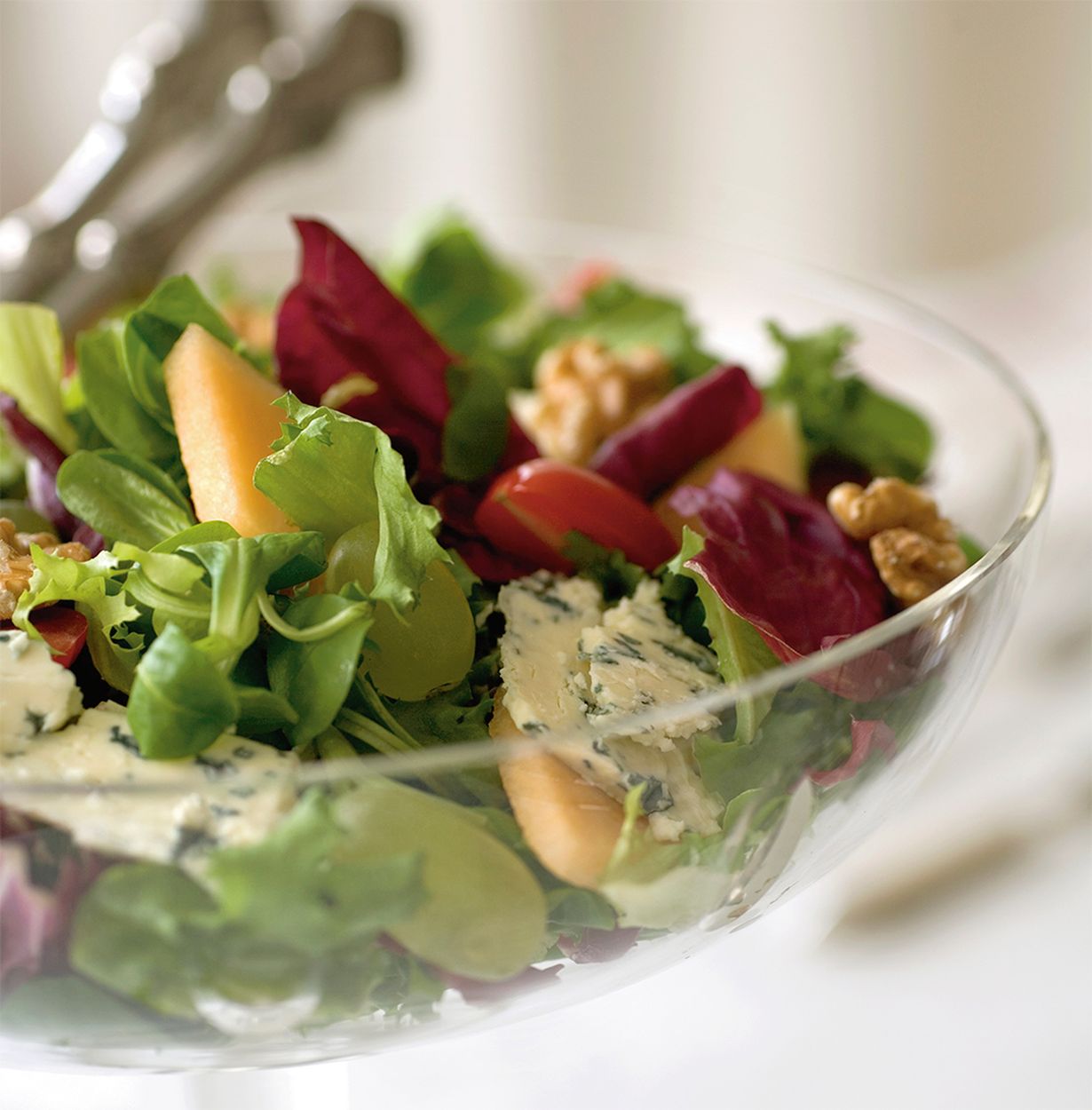 - Tee salaatti: Revi salaatti ja halkaise tomaatit. Halkaise meloni ja leikkaa hedelmäliha irti kuoresta. Paloittele hedelmät suupaloiksi. Leikkaa juustosta ohuita viipaleita. Sekoita salaattiainekset yhteen.