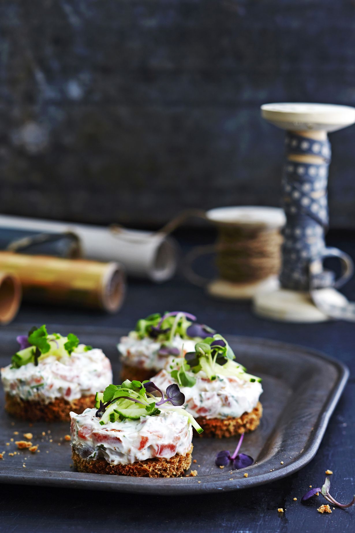 - Lusikoi täytettä jokaiselle leivälle. Koristele kurkkusuikaleilla ja tuoreilla yrteillä.