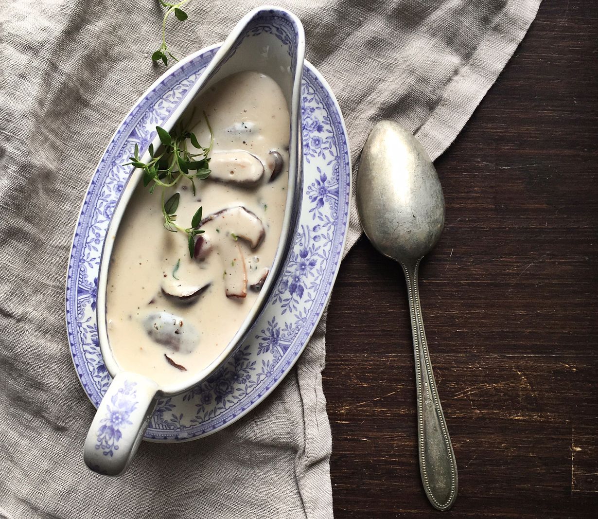 Pieni siirappilisäys ja ripaus muskottia aateloivat sienikastikkeen. Kaurakerman ansiosta kastike on vegaaninen.