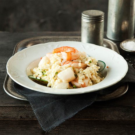 - Kun herneet ja riisi ovat kypsiä, lisää parmesaani ja voi. Tarjoa heti.