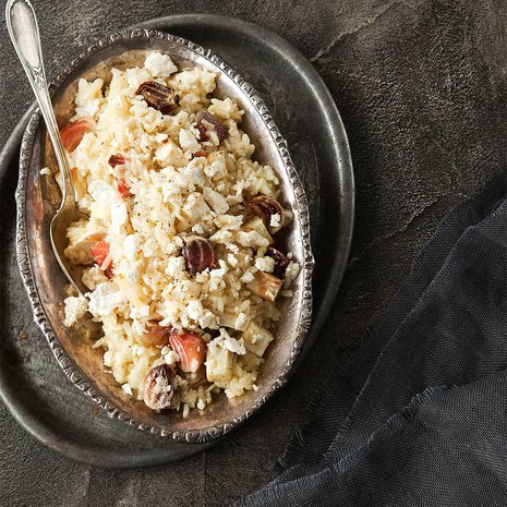- Lisää voi, parmesaani, hunaja ja sitruunamehu. Kääntele sekaisin. Jos risotto kaipaa kosteutta, lisää tilkka vettä.