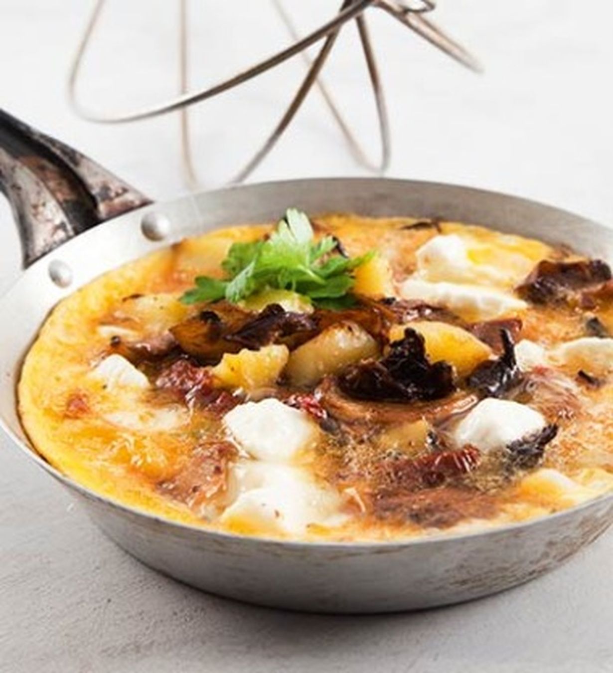 Kaada pannulle öljy. Voit käyttää tähän aurinkokuivattujen tomaattien öljyä. Lisää perunat ja paista niitä pari minuuttia. Lisää pienityt tomaatit ja feta. Kaada päälle munaseos.