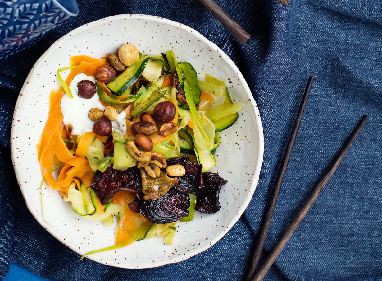 Vinkki! Tarjoa kasvisnuudelit lisäkkeenä tai höystä ne annoksiksi wasabikermalla, juuressipseillä ja paahdetuilla pähkinöillä.