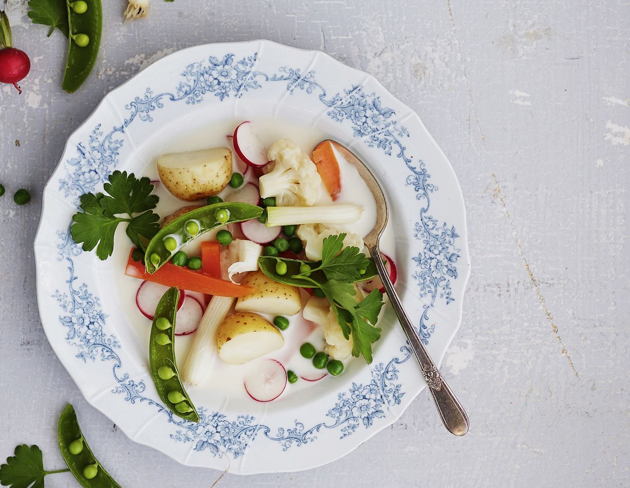 - Lisää kukkakaalit, porkkanat ja sipulit. Keitä kolme minuuttia. Lisää herneet ja retiisit ja keitä minuutti.