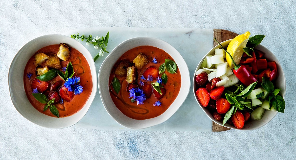 - Annostele keitto tarjoiluastioihin ja koristele mansikoilla, syötävillä kukilla ja basilikalla ja lorauta päälle hyvää oliiviöljyä. Voit lisätä päälle myös paahdettuja leipäkuutioita.