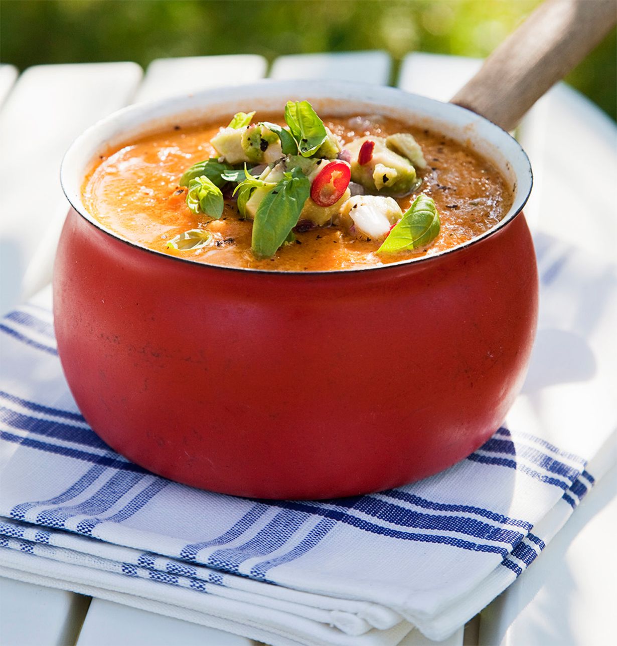 Nosta keitto jääkaappiin ja anna maustua vähintään 4 tuntia. Voit halutessasi tehdä keiton jo edellisenä päivänä valmiiksi. Annostele keitto lautasille ja nosta päälle avokadosalsa. Tarjoile sellaisenaan tai grillatun leivän kanssa.
