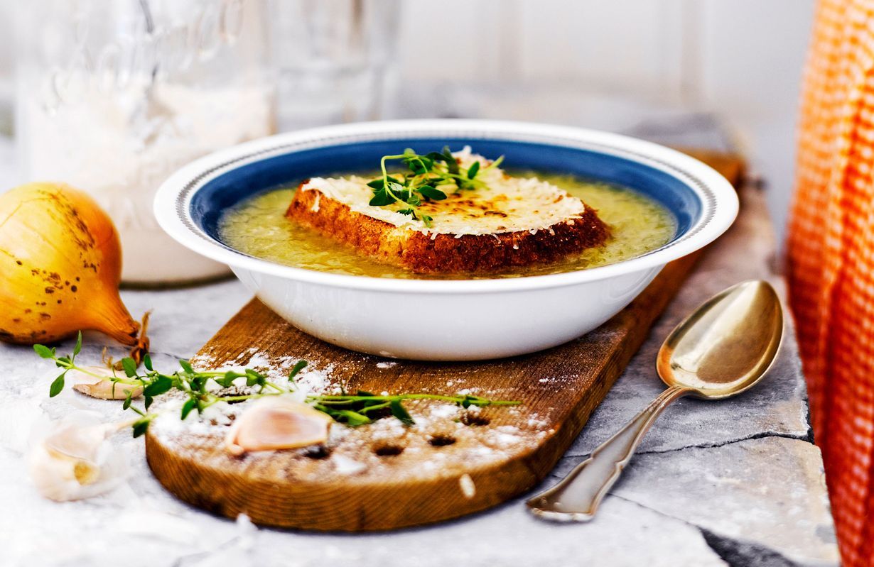 Sipulikeiton voi kätevästi valmistaa jo edellisenä päivänä, sillä keiton maku vain paranee odottaessa. Tarjoa keiton lisänä juustolla kuorrutettuja leipiä.