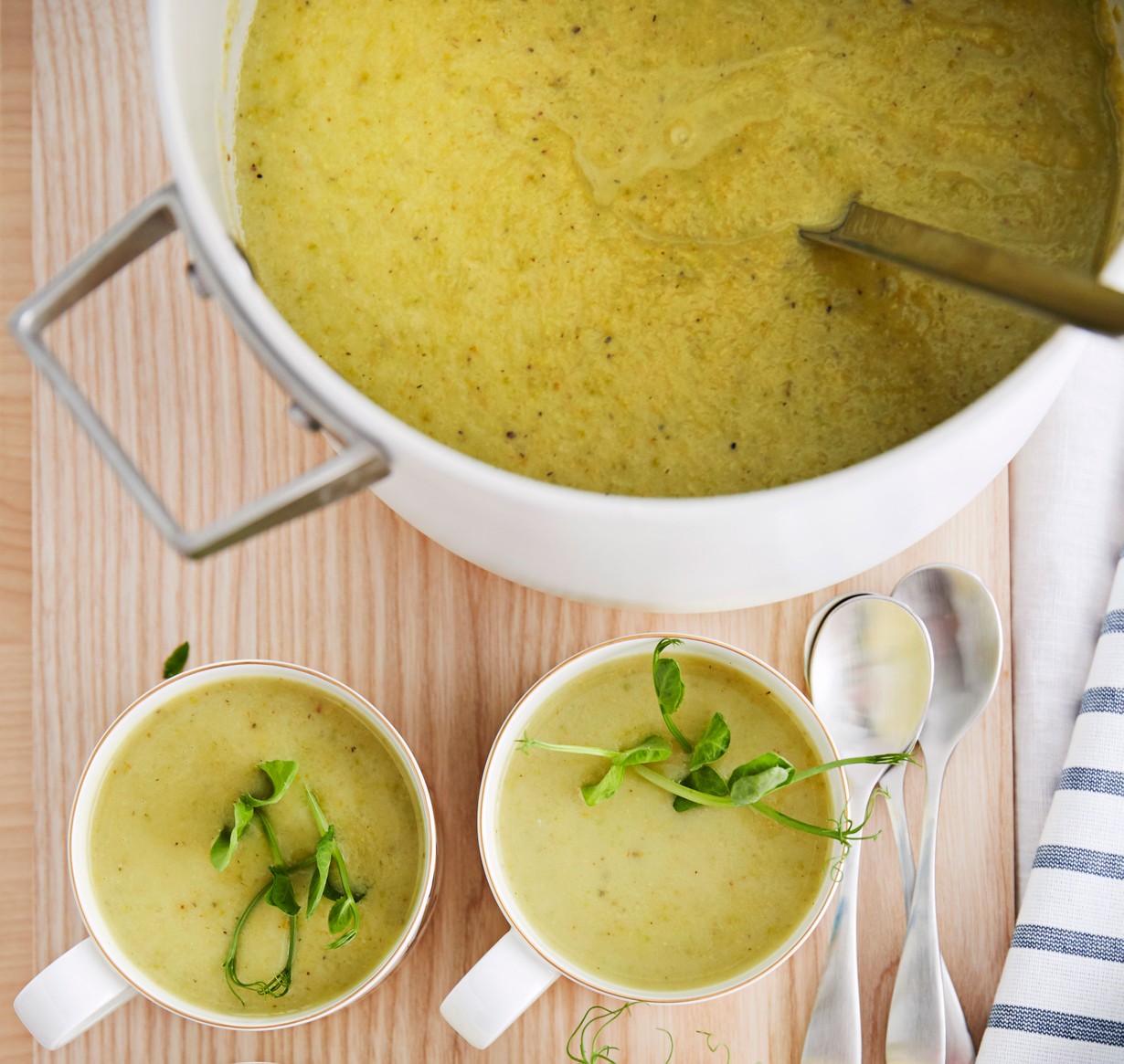 - Kuumenna keitto nopeasti ennen tarjoilua. Viimeistele herneenversoilla.