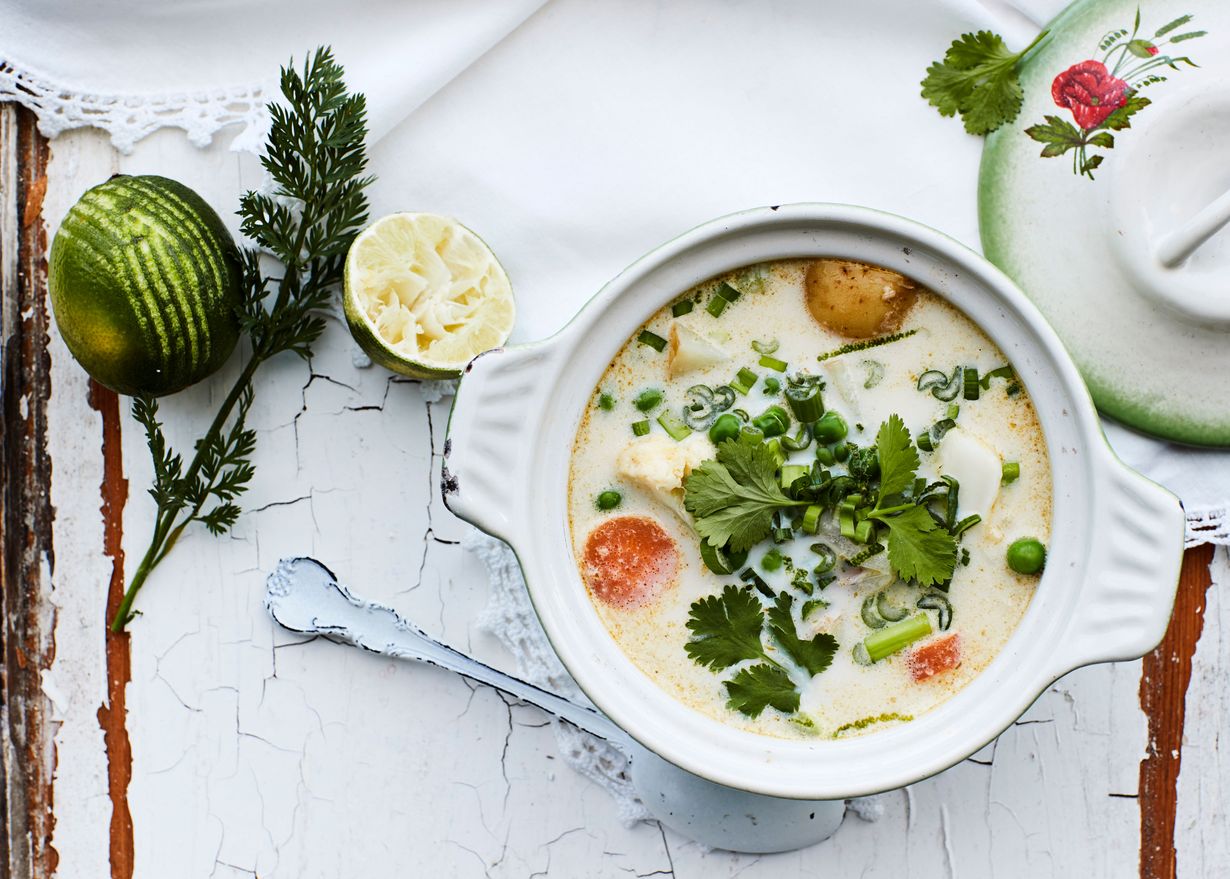 Kesäkasviksille riittää pesu ja rapsutus. Thai-tyyliin maustettu kesäkeitto maistuu ihanasti limetille ja kookokselle ja curry polttelee juuri sopivasti kielellä. Sovella kasviksia keittiösi ainesten mukaan.